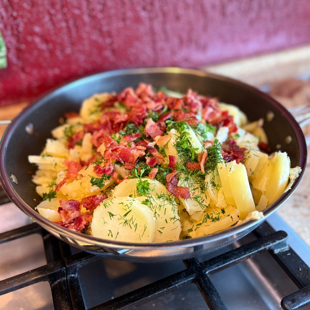 - Grab a generous pinch of each: parsley, dill, chives, and most of the bacon, and add it to the pot with the potatoes.