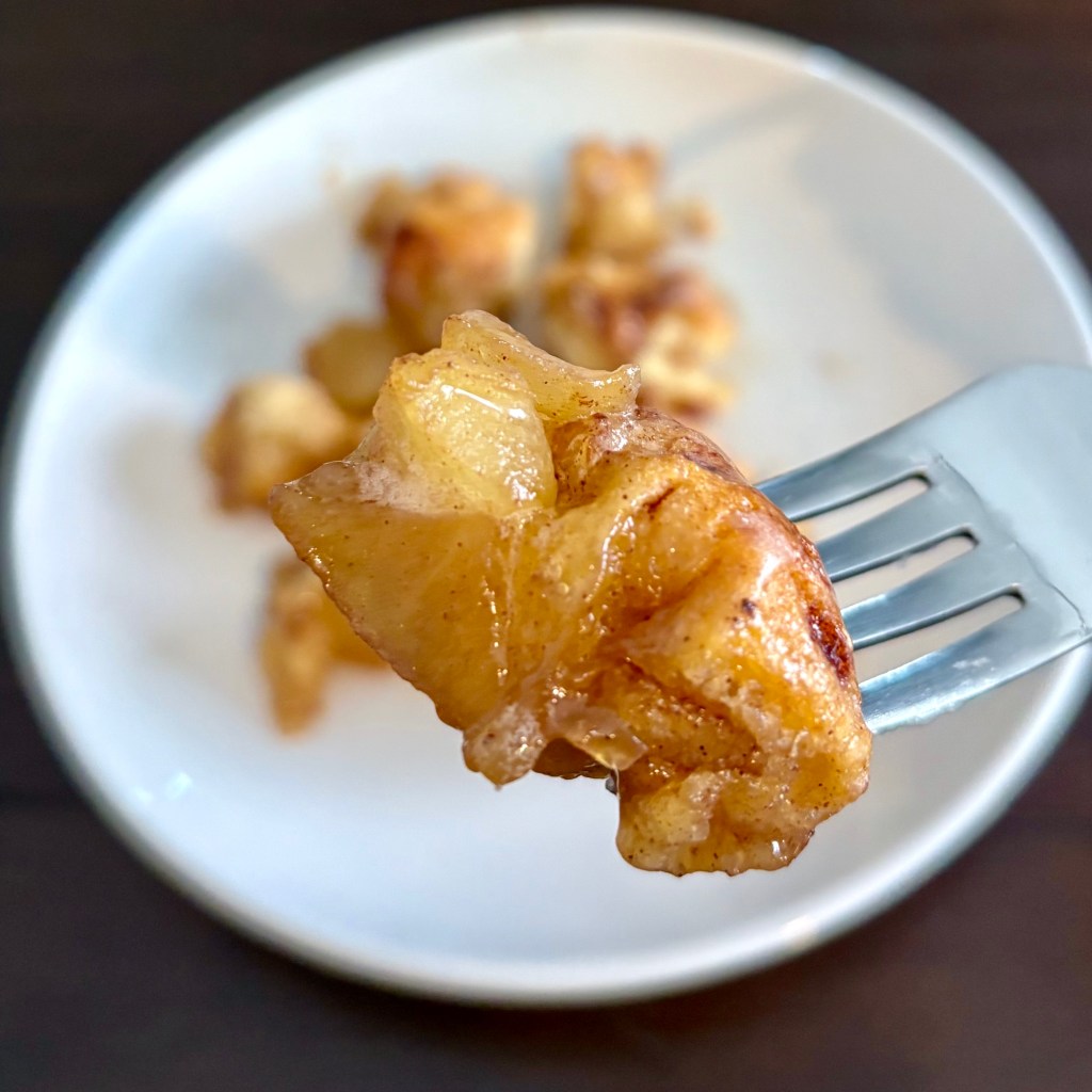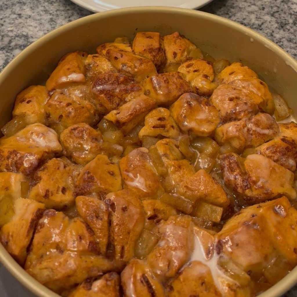 - Grease a 9” baking pan and add the cinnamon roll dough bites. Drain the microwaved apples and add them to the pan as well.