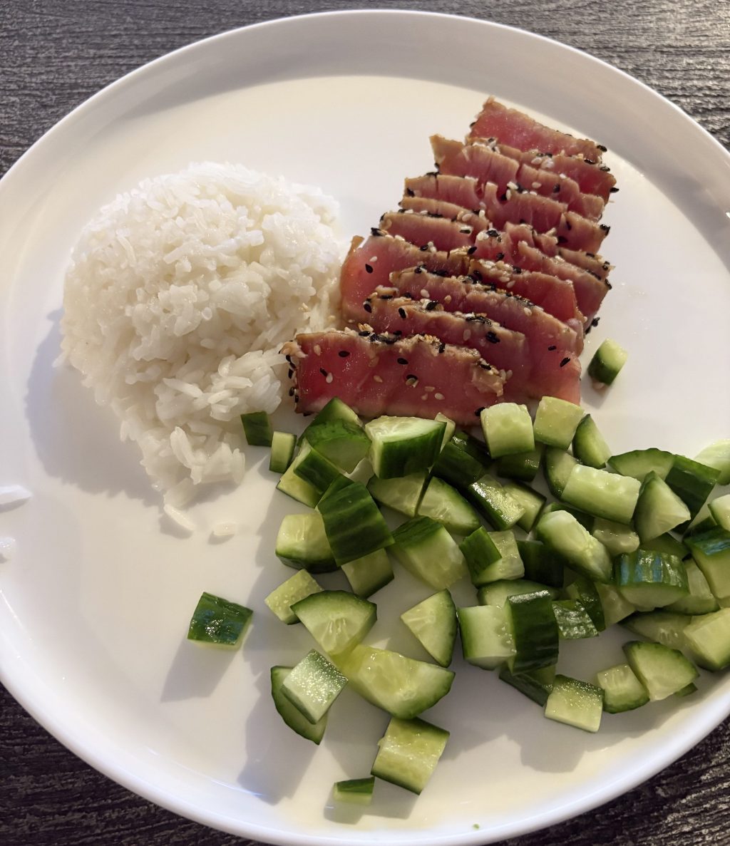 - 3 – four oz Ahi Tuna steaks (i buy these frozen from aldi, they are ~$5 for the 3 pack)